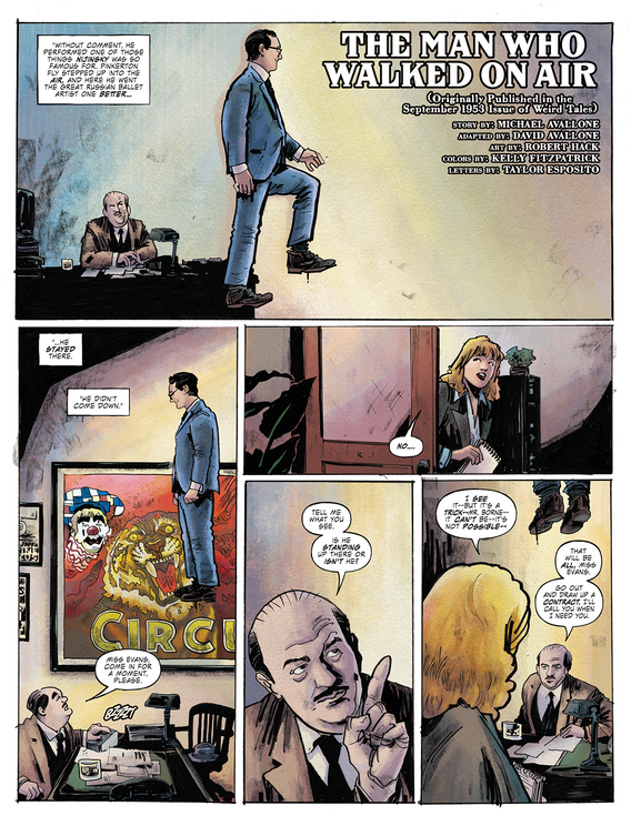 “My father, Michael Avallone, grew up reading Weird Tales... and in 1953, he was thrilled when he made the first professional sale in his long writing career to the magazine, with "The Man Who Walked On Air." I've always loved the story, and thought it was a shame one could only read it in crumbling pulp magazines, or a long-out-of-print anthology,” said David Avallone. “So naturally I was thrilled at the idea of this (appropriately post mortem) collaboration with my late father, adapting this terrific little tale to comic book form. When I was asked who I'd like to illustrate it, my first choice was Robert Hack... an amazingly talented artist who I also knew to be a fan of my father's writing. I think the result speaks for itself: you're gonna love it.”