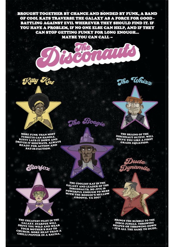 The Disconauts crew is comprised of The Boogie, Kitty Kat, Starfox, Dude Dynamite